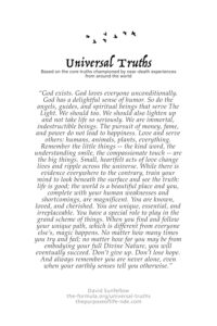 — Universal Truths by David Sunfellow (based on the core truths championed by near-death experiences from around the world)