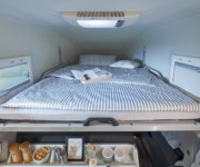 Based on the regular Transit Custom, the Nugget Camper has a double bed that folds out in the roof space, and a second living area with another double bed that folds out whenever needed. The L-shaped kitchenette at the rear is equipped with a double-burner gas cooker, sink and 40-liter refrigerator, whereas fresh and waste water is supplied from the on-board tanks.