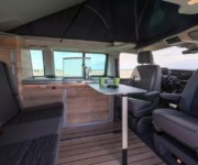 There’s room for five people around the fold-out table, and three more can sit on the forward-facing bench. Additionally, the driver and passenger front seats swivel 180 degrees thanks to the folding handbrake, and there’s another fold-out table with two more chairs available as an optional extra.