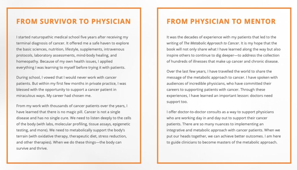 “Importantly, once you’ve done chemo or extensive radiation, your chances of remission through alternative methods are slim, as the damage done is too great. I’ve yet to talk to an expert in alternative cancer treatments that does not agree with this statement. In order for holistic treatment to work, it needs to be done first. This in turn means you have to be brave enough, and not too panic stricken, to explore your options and give them time to work before jumping into the ‘cut, poison, burn’ paradigm.”